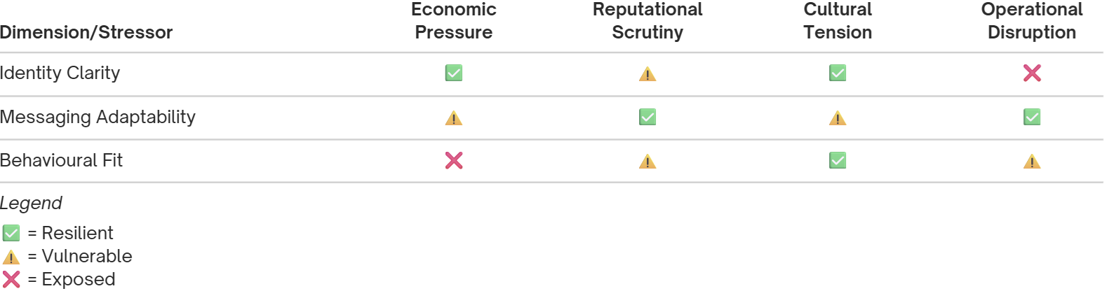 The Pressure Test Grid is designed to be simple, visual, and actionable. Its format is a 3x3 matrix that allows leaders to quickly map how their brand performs across dimensions and stressors. Each cell represents a diagnostic checkpoint, where resilience can be marked as Resilient (✅), Vulnerable (⚠️), or Exposed (❌). This visual format makes it easy to see patterns: strengths that hold across scenarios, vulnerabilities that cluster in certain areas, and exposures that demand immediate attention.